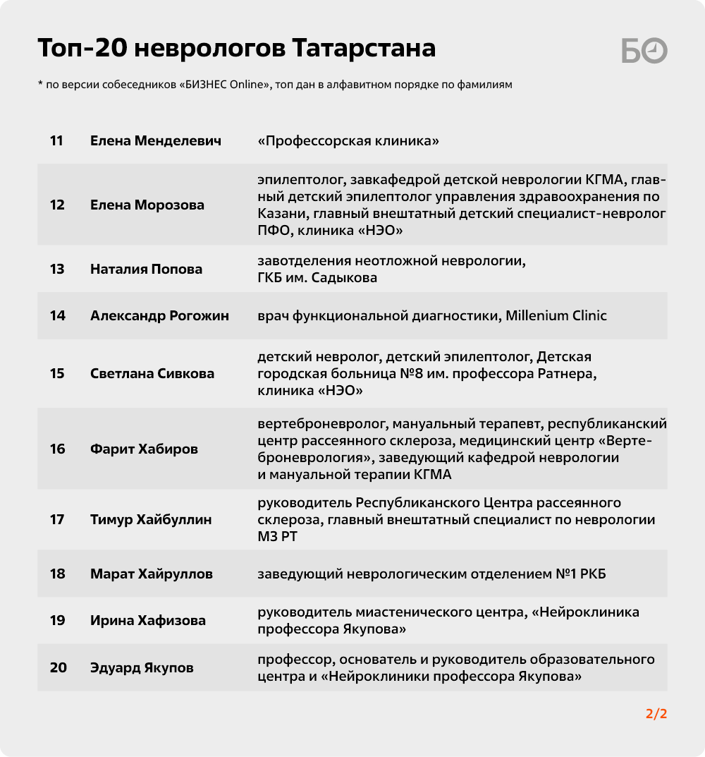 Инсультологическая служба в Татарстане выстроена мастерски, и это заслуга профессора Дины Хасановой. Она получила титул «Врач года» Татарстана в 2012-м, больше 40 лет в медицине. Ее называют асом ангионеврологии, она «поставила» инсультологическую службу в республике, сейчас курирует эту сферу на уровне всего Поволжья как главный внештатный невролог ПФО. Собеседники отмечают, что к ней на обычный прием не попасть (поэтому она не вошла в топ практиков), Хасанова консультирует врачей в неврологических отделениях МКДЦ и 7‑й горбольницы.