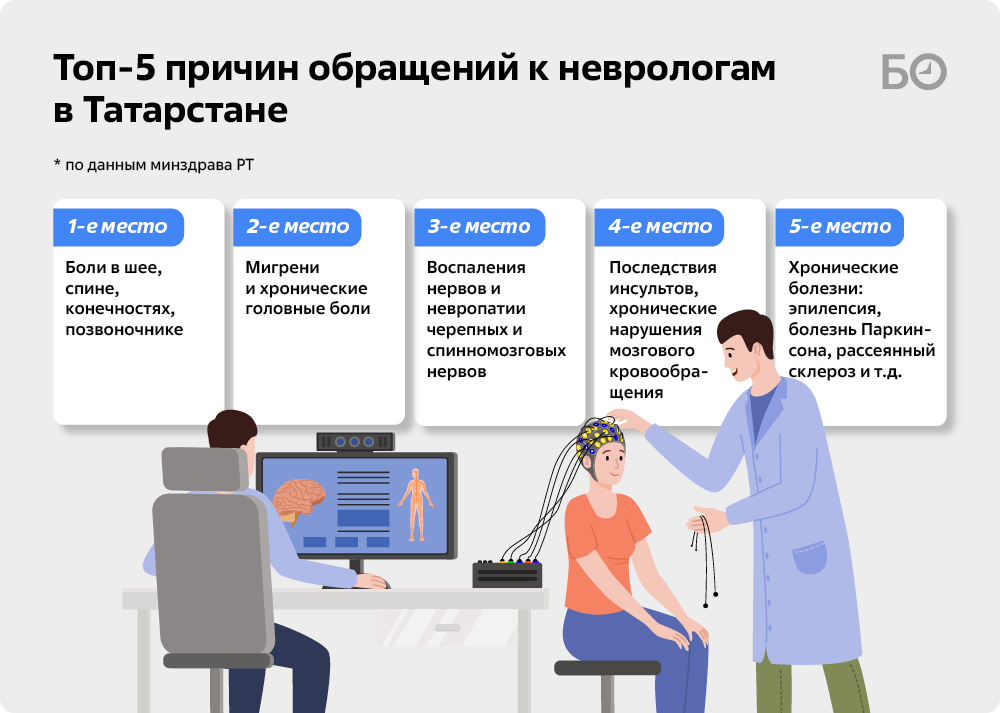 По данным минздрава Татарстана, в топе запросов к неврологам — боли в шее, спине, конечностях, мигрени, невриты, последствия инсультов. Но с течением времени портрет пациента меняется.