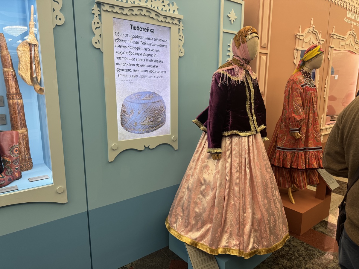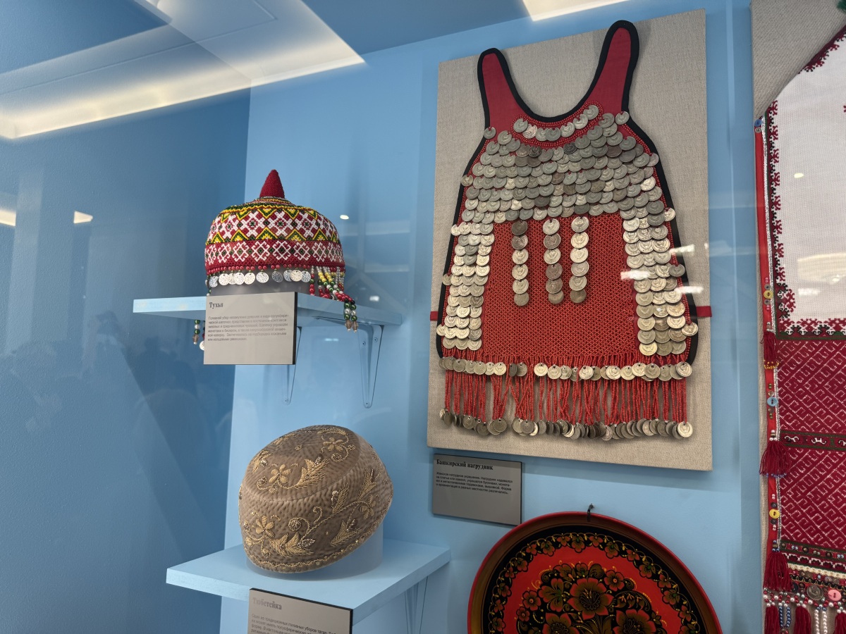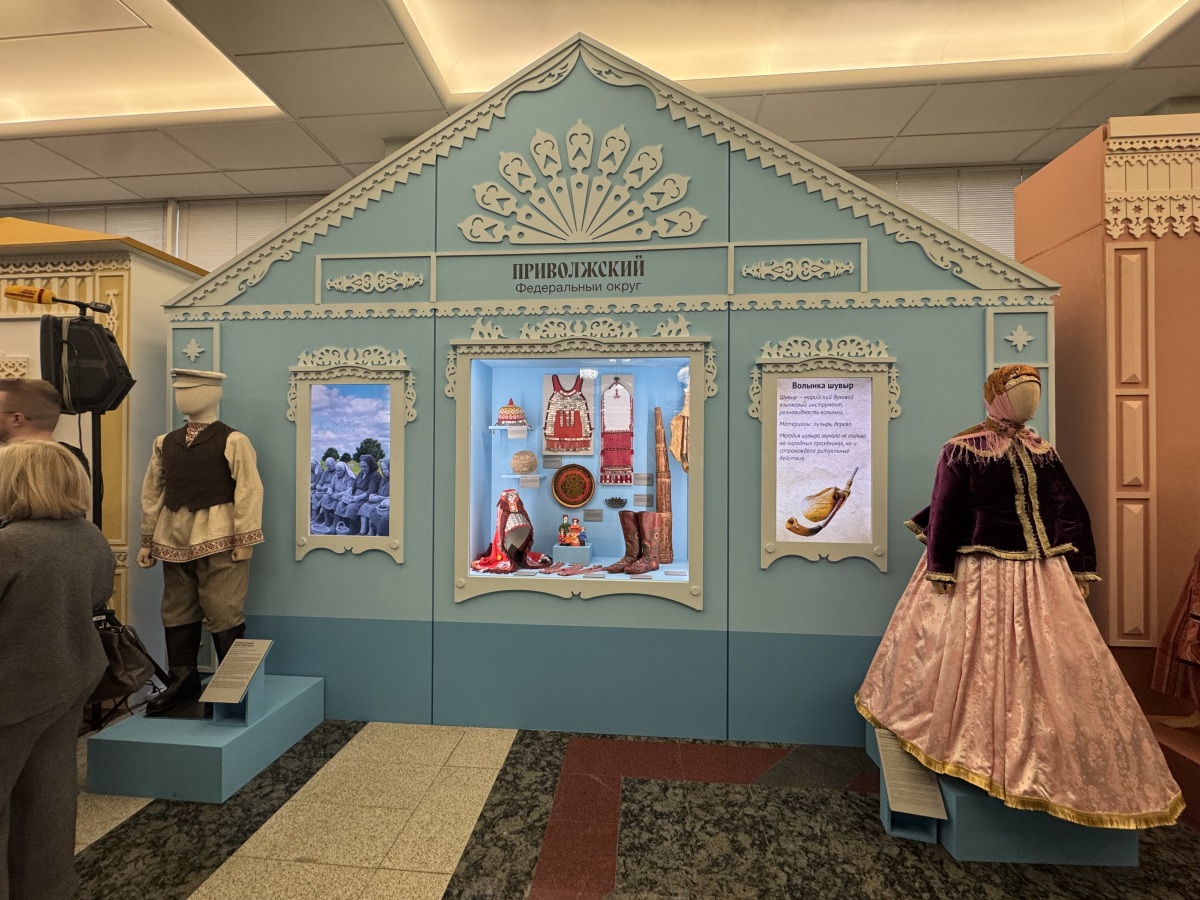 На стенде, посвященном Приволжскому федерального округу (ПФО), представлены такие экспонаты: ичиги (сапоги), волынка шувыр (марийский духовой язычковый инструмент), кускерттон (пояс удмуртов), дымковская игрушка, айшон (головной убор замужних удмурток), тюбетейка, тухья (головной убор незамужних девушек-чувашек), башкирский нагрудник, тарелка с хохломской росписью, шымакш (головной убор замужних мариек), торама (мордовский духовой инструмент), пермский звериный стиль. Также показаны русский женский костюм Нижегородской области и русский мужской костюм Поволжья. Кроме того, тюбетейка представлена на экспозиции Центрального федерального округа, а калфак — Уральского федерального округа.