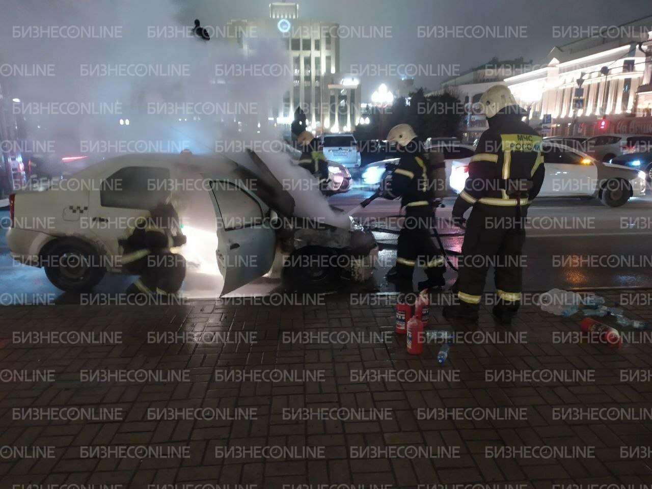 Возгорание уже потушили сотрудники МЧС, прибывшие на место. Всего на площадь Свободы прибыли две пожарные машины. Сначала пожар тушили другие автомобилисты. Все еще можно наблюдать столб дыма, исходящего от капота Renault.