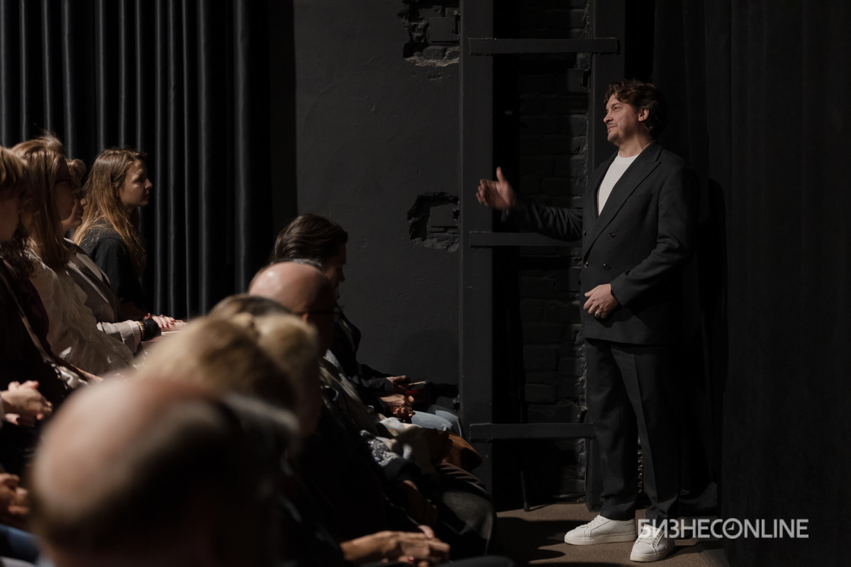 «Радостно, что многие из наших друзей приехали именно по случаю 10-го сезона театра. Говорить „10-й сезон“ очень необычно для нас. Как-то это очень весомо звучит. 8 лет назад (потому что начинали мы не здесь, а на чердаке) я вот так же выходил. Автоматического занавеса еще не было, сиденья не такие удобные, а были обычные пластиковые стулья из IKEA. И вот наступает 10-й сезон. Мы долго думали, как отметить, как понять, что это не сон для нашего маленького камерного театра. И поняли, что хотим с вами поделиться тем, что у нас родилось за эти 10 сезонов», — отметил художественный руководитель театра Михаил Волконадский.