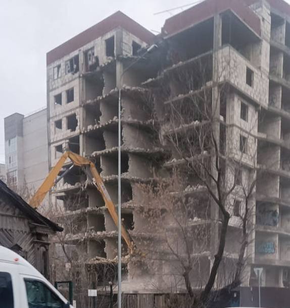 Недостроенное здание со стороны улицы Хади Такташа рядом с набережной Кабана начали сносить в Казани. Фото начала демонтажных работ с «БИЗНЕС Online» поделились очевидцы.