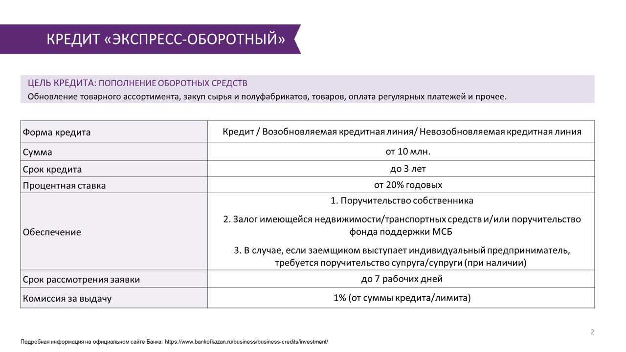 Для оперативного решения текущих потребностей бизнеса банк предлагает кредит «экспресс-оборотный» с сроком до 3 лет. Его можно направить на возобновление товарного ассортимента, закупку сырья, оплату регулярных обязательств и другие задачи.
