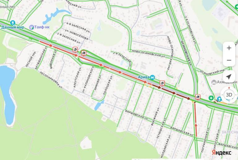 Так, пробка начинается от Лесного переулка в жилом массиве Залесный и длится до пересечения улиц Залесной и Осиновской. Судя по видео с ДТП, которые появилось в телеграм-каналах, на месте столкнулись несколько иномарок и LADA.