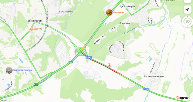 На дороге в направлении Иннополиса произошло ДТП, свидетельствуют данные сервиса «Яндекс.Карты». На участке собралась пробка в 2,2 километра. Она увеличивается и отмечена бордовым цветом.