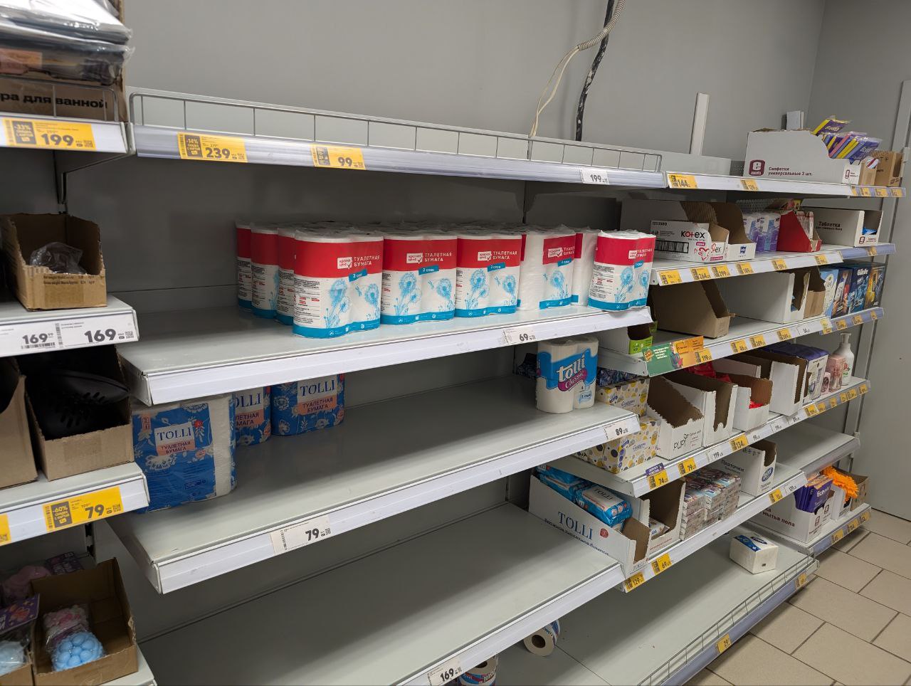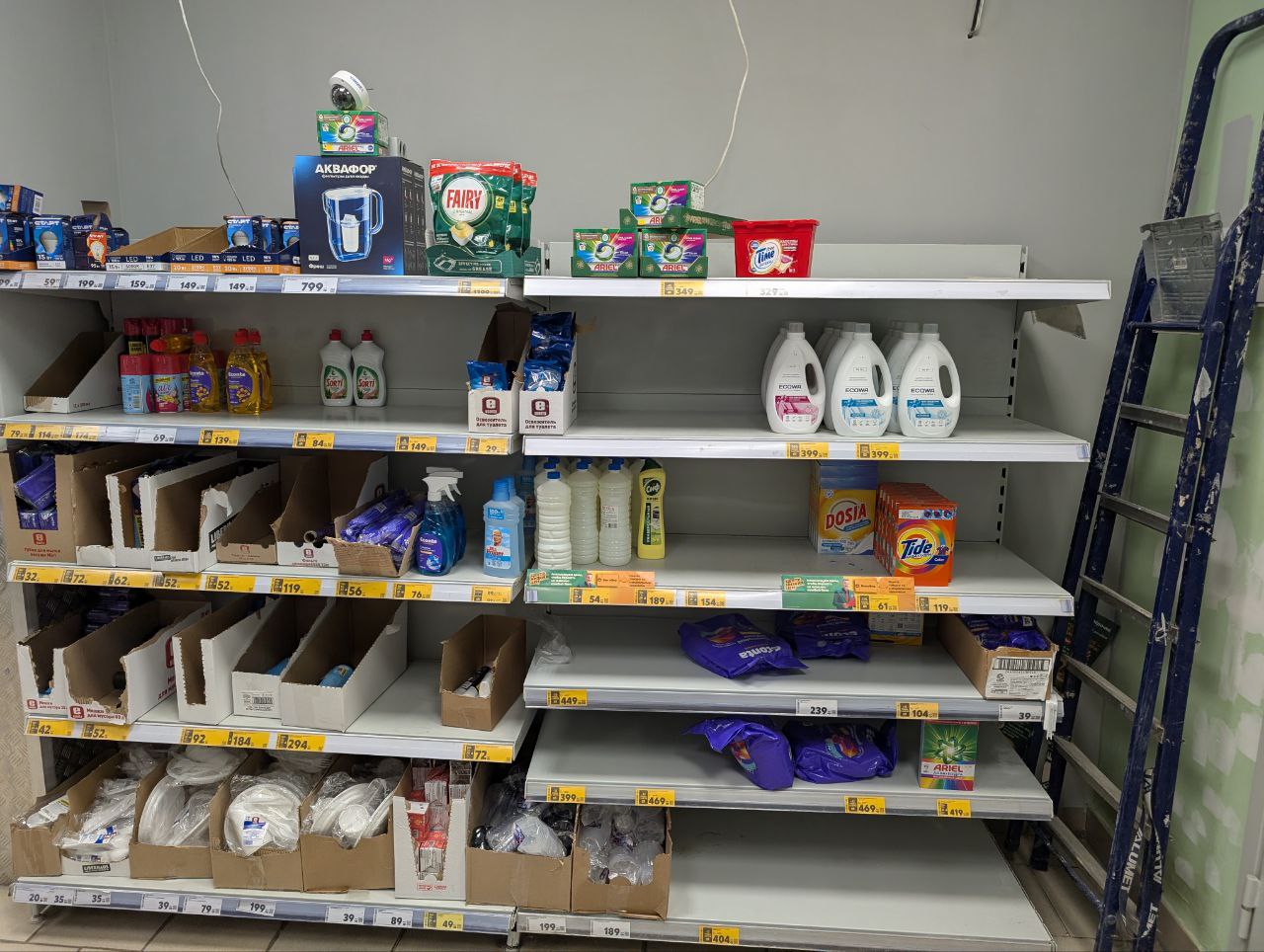 На кадрах можно заметить нехватку хлеба в одном из магазинов, на других полках — отсутствие товаров бытовой химии.