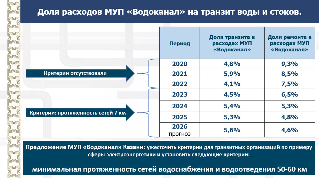 «В начале 2025 года у водоканала были договоры на транзит с 6 организациями, затраты за год на транспортировку воды и стоков составили 386 миллионов рублей. Эти средства могли быть направлены на восстановление наших сетей и сооружений, поэтому мы предлагаем прекратить привлечение транзитных организаций к транспортировке воды и рассчитываем на поддержку УФАС России, правительства Татарстана и госкомитета РТ по тарифам», — заключил Абдулхаков.