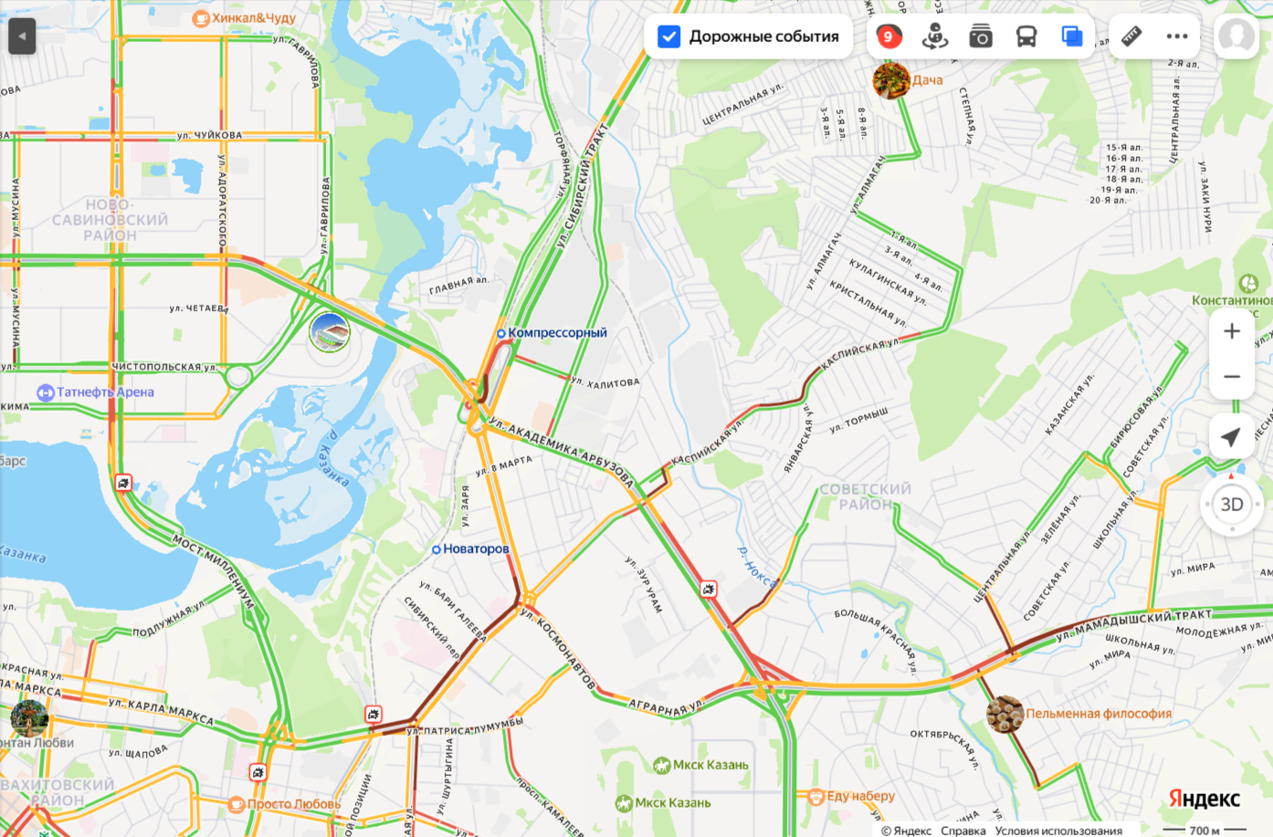 В Казани в утренний час пик общий уровень пробок достиг 9 баллов. Об этом свидетельствуют данные «Яндекс.Карт». Сильные пробки в Казани наблюдаются уже третий день подряд.