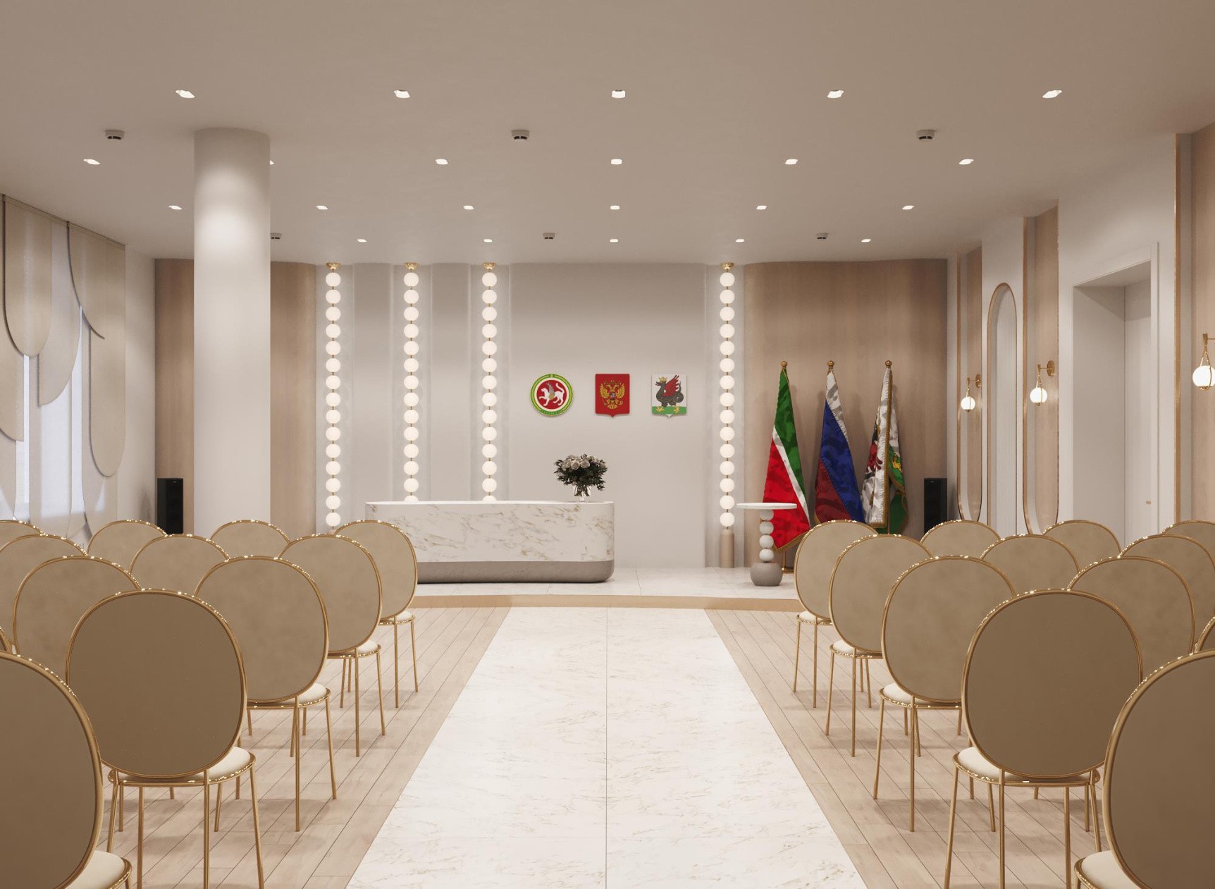 Судя по рендерам, в приволжском загсе обновят входную группу, холл, залы ожидания и бракосочетания. Также в здании планируют разместить кухню с обеденным столом. Все помещения оформят в единой бежевой палитре.