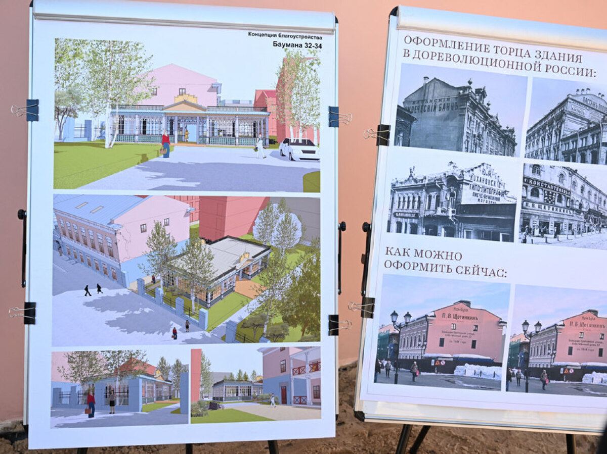 Дома № 32 и 34 на улице Баумана представляют собой единый исторический комплекс. Реставрационно-восстановительные работы на объектах ведутся одновременно. Готовность дома № 32, площадь которого составляет 851,9 кв. м, оценивается в 90%, сдать его в эксплуатацию планируют до конца текущего года. Второе здание комплекса — дом № 34 — имеет площадь 647,8 кв. м, там ведут работы по замене кровли.
