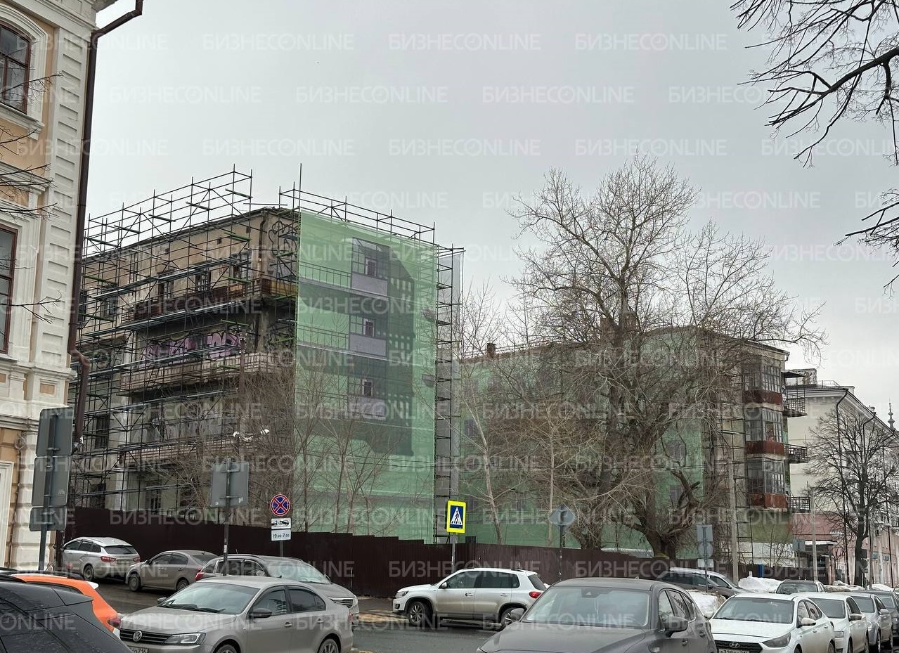 На Мергасовском доме в Казани появилась строительная драпировка, обратил внимание корреспондент «БИЗНЕС Online». Пока она закрывает лишь часть здания со стороны улицы Дзержинского.