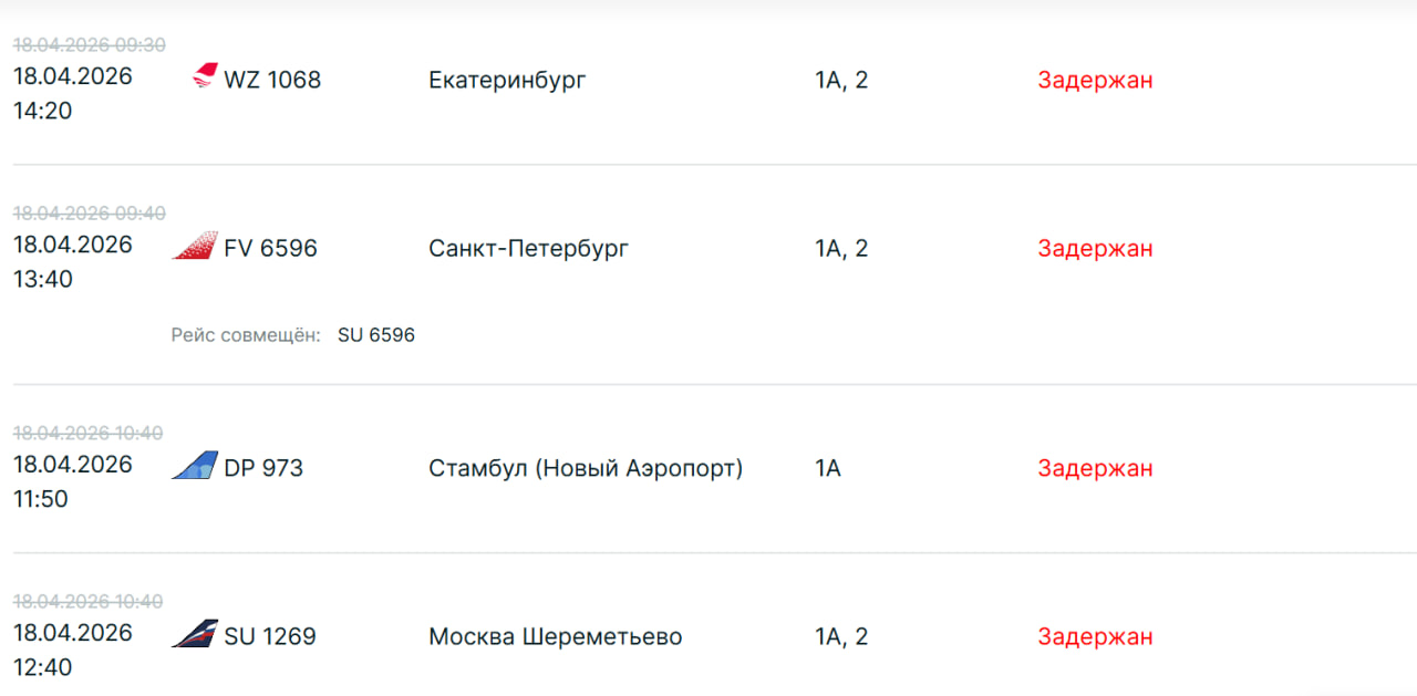 На четыре часа задерживается утренний рейс в Москву, на 2,5 часа — в Тобольск, на четыре часа — в Стамбул, на 6 часов — в Душанбе, почти на четыре часа — в Санкт-Петербург. Также позже на пять часов вылетит самолет в Екатеринбург, на четыре часа — еще один рейс в Санкт-Петербург, на один час — в Стамбул, на два часа — в Москву.